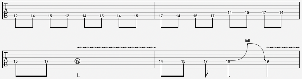 This is a simple three-note pattern starting on the B string that uses both hammer-ons and pull-offs.