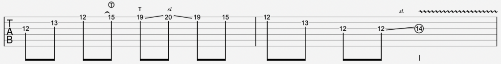 Here’s a simple three-string sweep arpeggio with a tap and slide at the end. Just like I demo in the video, when I talk about adding life to your arpeggios so they don’t sound so mechanical and typical.